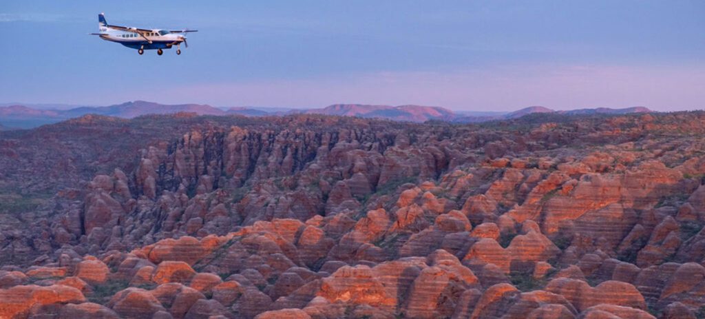 Then it’s north to Kununurra, where the landscape opens into sweeping ridges, hidden waterholes, and some of Western Australia’s most striking terrain. You’ll fly over the Bungle Bungle Range, glimpse the storied Argyle Diamond Mine, and admire the vastness of Lake Argyle, a freshwater sea in the desert.